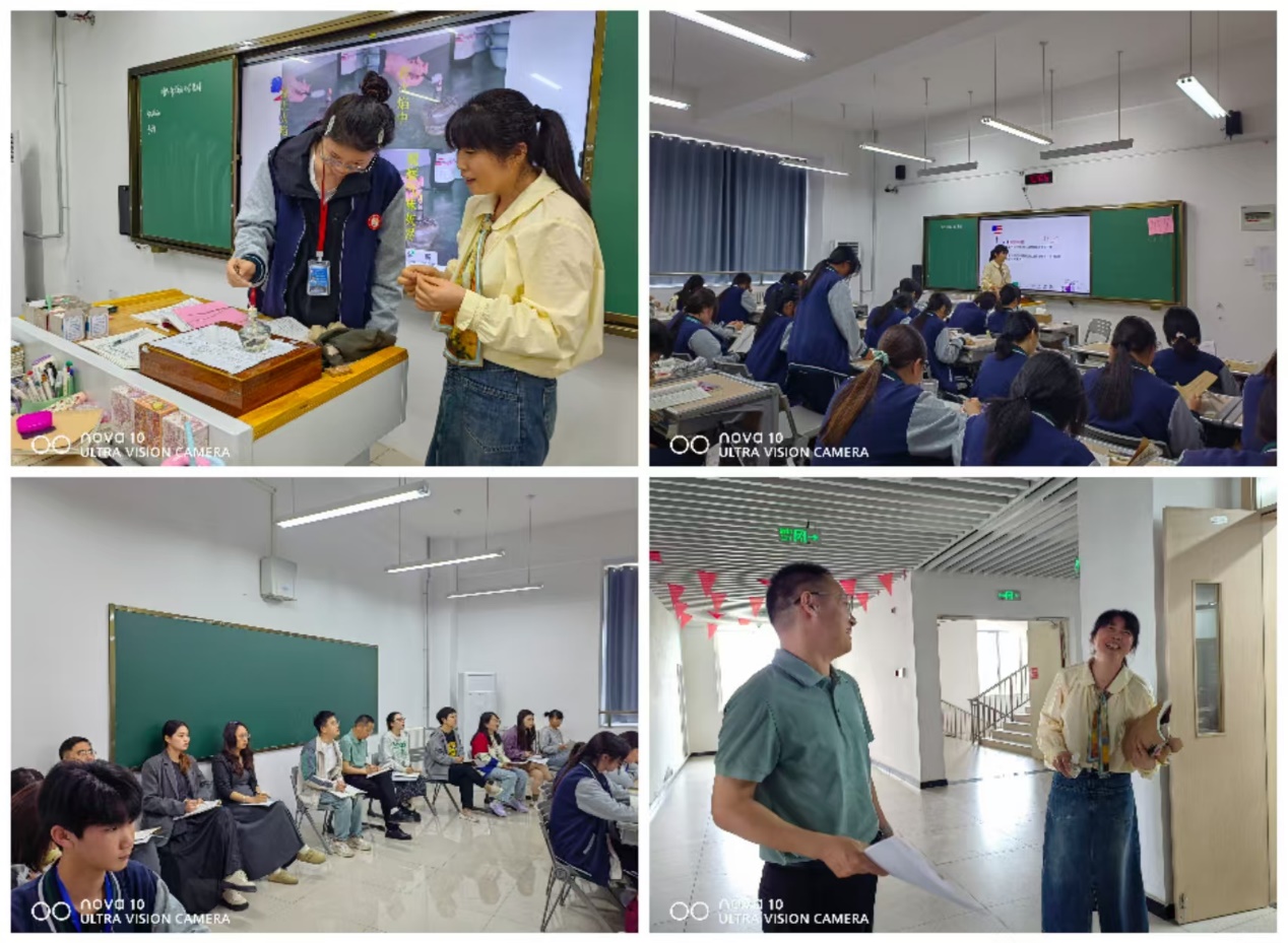 活动中,督导组深入课堂听取《纤维化学与面料分析》课程,教师通过“浸渍法溶解实验”演示纤维鉴别技术,学生分组完成涤纶、棉纤维溶解对比;《纺织材料检测》课上,学生熟练操作气流仪检测纤维细度,数据实时录入实训报告;英语课强化专业英语应用能力。