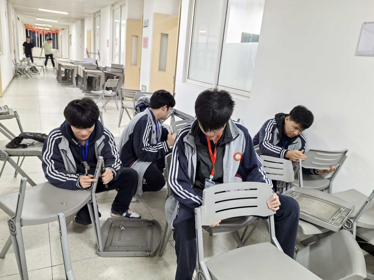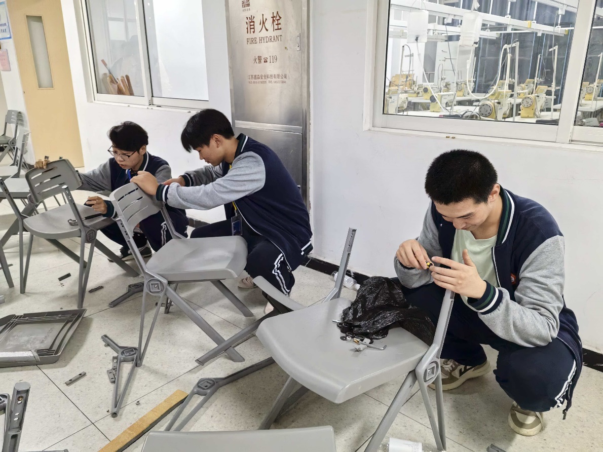 活动期间,同学们热情饱满、分工协作,携带专业维修工具对教学区损坏桌椅逐一细致排查。面对螺丝松动、部件破损等常见问题,大家熟练运用专业技能,有条不紊地开展加固、部件更换等操作,全程展现出严谨的劳动态度与扎实的实践功底,让一批 “带病” 桌凳重新恢复使用。