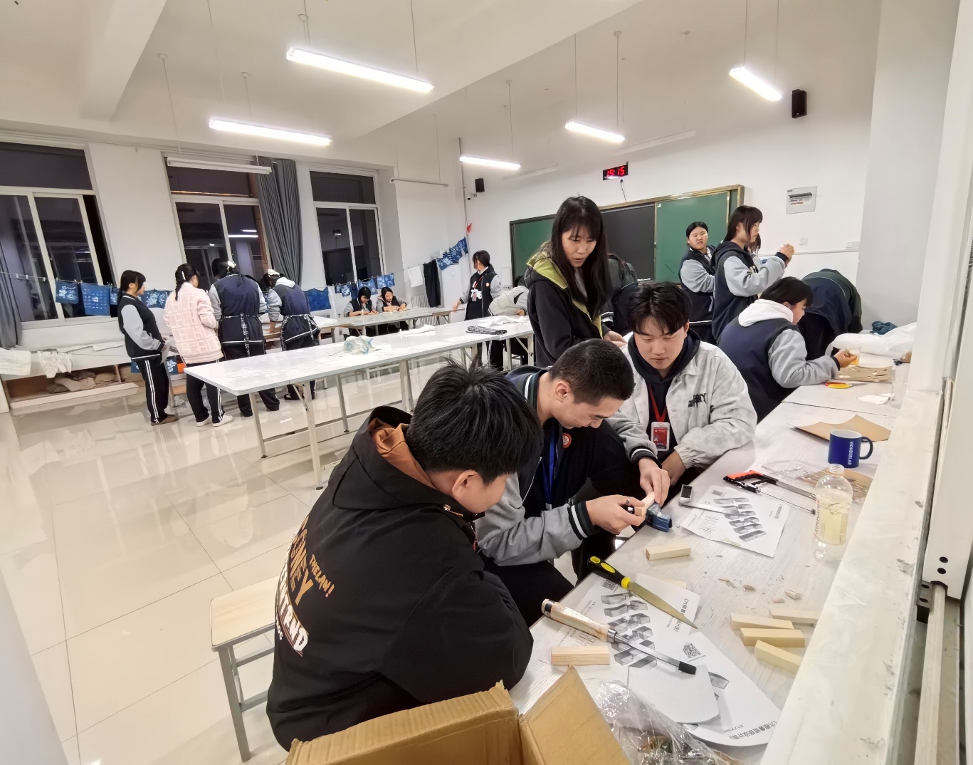 面点实训室里,同学们围站桌前分工协作,调馅、擀皮、捏褶一气呵成。从起初的 “漏馅水饺” 到成型的 “月牙饺”“元宝饺”,在老师指导下,大家快速掌握技巧,欢声笑语中摆满托盘。木工区,鲁班锁的榫卯拼接声此起彼伏,学生们对照图纸反复调试,在拆解组装中领悟传统工艺的智慧。