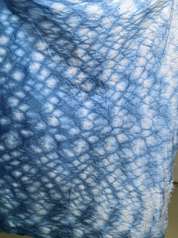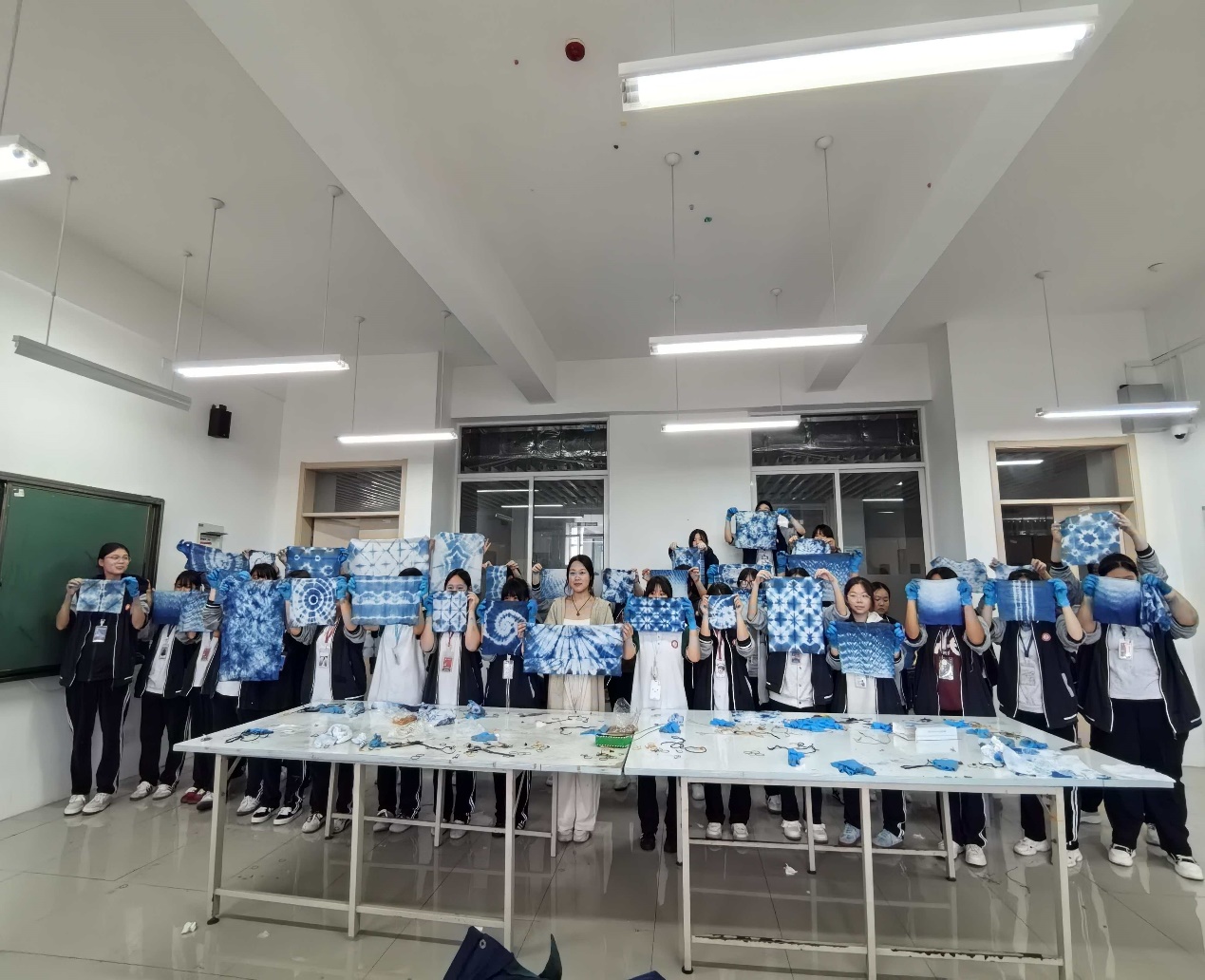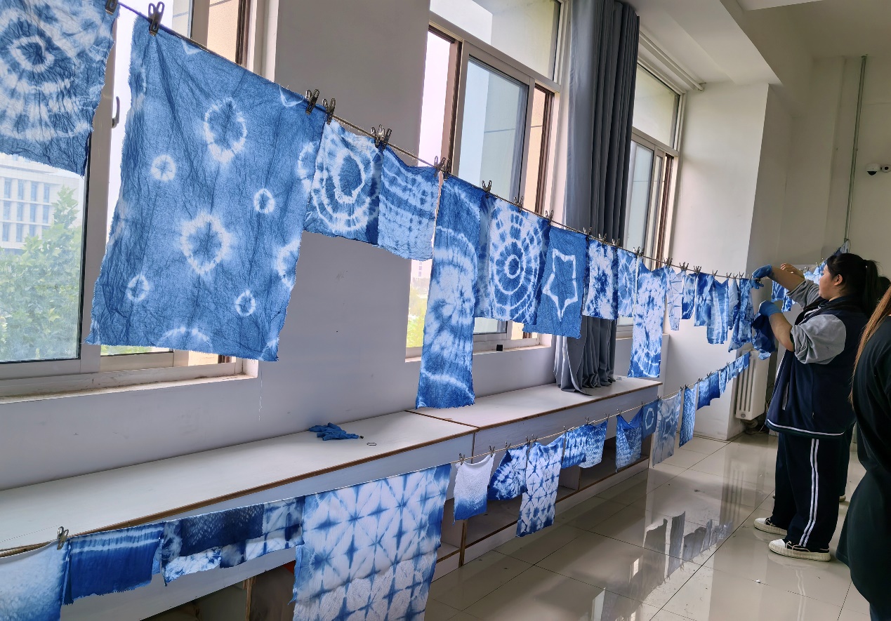 染色环节中,学生们精准控制染料浓度与浸泡时间,看着白布在靛蓝、色彩中逐渐晕染出层次丰富的纹路,现场充满惊喜与欢呼。经过固色、晾晒,四十多件风格各异的扎染作品新鲜出炉,既有传统韵味,又融入现代审美。