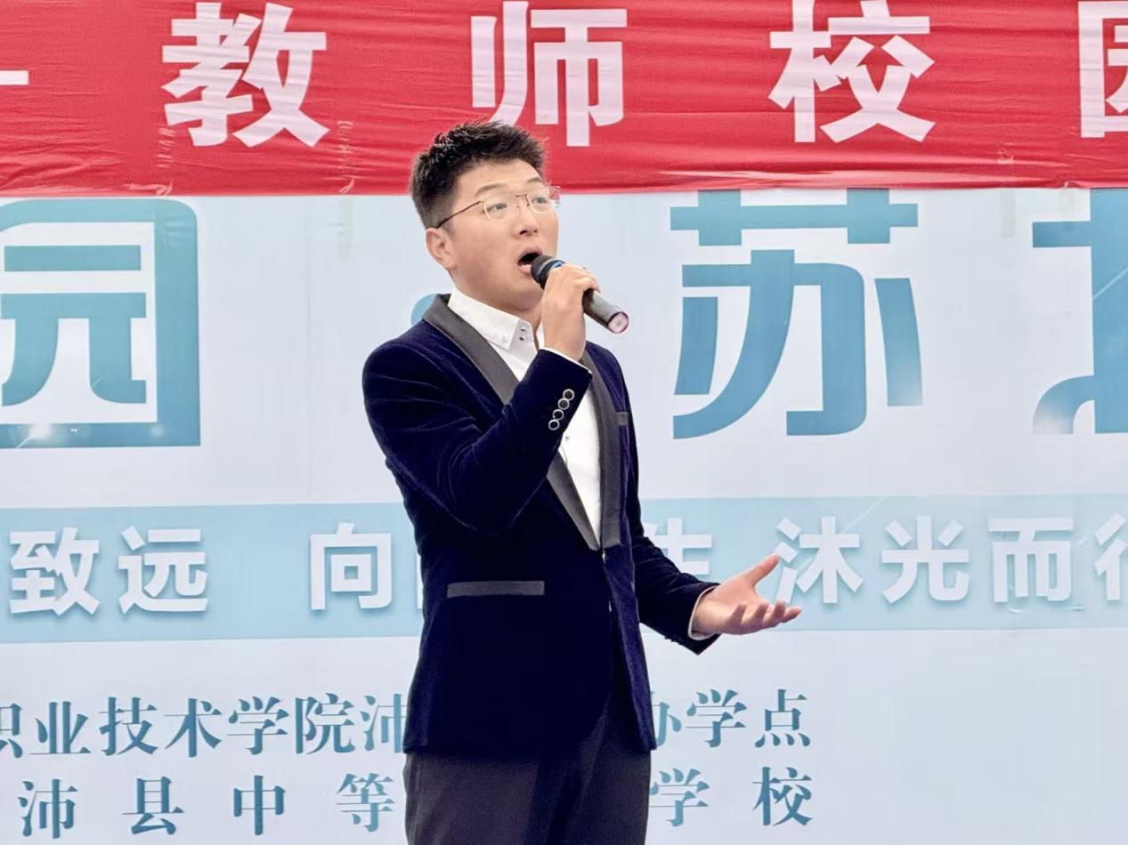 下午16时10分,校园广场苏北风舞台旋律飞扬,掌声如潮。声乐教师胡宏强、孟杰、杜艺彤联袂登台,与部分学生同台演出。音乐会曲目丰富,涵盖经典民歌、爱国主义歌曲与音乐剧选段,既展现了教师们严谨治学之外的多才多艺与积极向上的精神风貌,也通过艺术的共同语言,打开了师生情感交流的新通道。尤其在师生合作环节,默契的配合与真挚的演绎,不仅体现了教学相长的教育理念,更在潜移默化中完成了美育的浸润与榜样力量的传递。